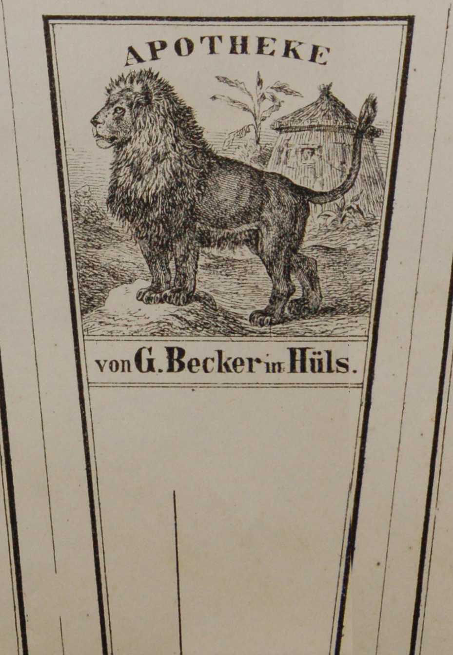 nach oben Familie & Leben Ausbildung & Beruf Botanik Mitgliedschaften Würdigung Herbarbelege Quellen & Literatur Gustav Beckergeb. 22. Mai 1815 in Höxter (Nordrhein-Westfalen, Deutschland) gest. 25. Juli 1880 in Bonn (Nordrhein-Westfalen, Deutschland) Bisher sind keine abweichenden Namensformen belegt. Apotheker in Bonn. Familie und privates Leben Vor und mit 1853 [https://www.zobodat.at/publikation_series.php?id=21282 p. 9] bis 1873 ist Becker als Apotheker in Hüls (heute ein Stadtteil von Krefeld) nachgewiesen. [Laubenburg 1898: 36.] Die Scheda von HEID 742307, einer Ausammlung von «Carum verticillatum Kch» vom 16.VI.1871 aus Heinsberg, wurde aus einem Bogen mit Etiketten für Tüten (?) von Beckers Apotheke geschnitten, auf denen eine markante Löwendarstellung zu sehen ist (Abb. 2). Noch heute [Stand 2026-01-14] gibt es in Krefeld-Hüls eine Löwen-Apotheke.Orte mit Bezug zur Person