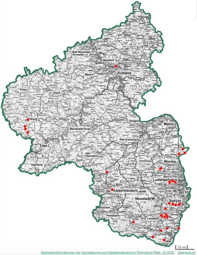 | Bemerkungen (Taxon) | Laut Blaufuss & Reichert (1992: 821) kommt die Art im Hunsrück und Hochwald nicht vor, sondern im Gebiet nur bei Bad Kreuznach, in Rheinhessen und an zwei Stellen in der Westpfalz, also in tieferen (wärmeren?) Lagen. Zur aktuellen Verbreitung in Rheinland-Pfalz siehe: Karte (Stand: 2023-10-29). | ||